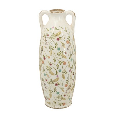 This 3-piece vase set features a sun medallion design in gold on white. Heights: 32.5", 28.5", 24.6". Uniform 5.9" bases. Weighted for stability. Ideal as a decorative centerpiece or floral vase.