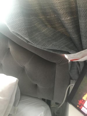 A: The upholstery fabric on Angelica Tufted Headboard from Christopher Knight Home is a polyester‑fabric upholstery, not velvet or chenille.