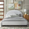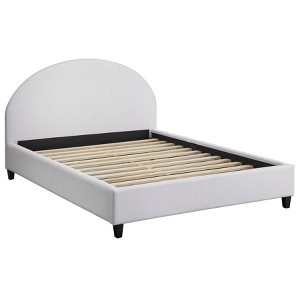Enrich your inner sanctuary with the modern Ava Upholstered Queen Platform Bed from angelo:HOME. Fully padded and upholstered on all sides in a fresh white linen-like fabric. The round headboard design makes this bed the centerpiece in your master suite, guestroom, or any other bedroom. Constructed of MDF with a sturdy frame and modern flair, the perfect combination to show off your sense of personal style.