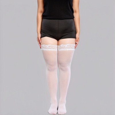 Anna-Kaci 2pcs Women's Plus Size Lace Top Thigh High Stockings Sheer Smooth Finish Soft Stretch Hold-Up Design and Delicate Floral Trim Detail - White