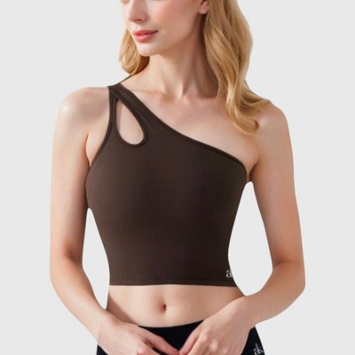 Product Name: Anna-Kaci Active Women's Ribbed Halter Crop Tank Top with Deep V Neckline Seam Detailing - Brown, Medium