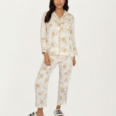 2-Piece Pajama Set: Includes a long sleeve button-front top with notched collar and coordinating full-length pants.
