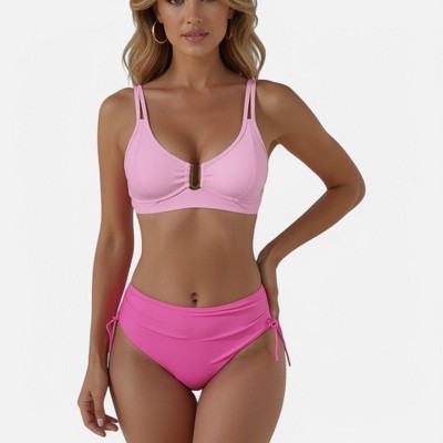 Anna-Kaci Swim Women's Two-Tone Bikini Set with Double Strap Top and High Waist Ruched Bottom with Side Tie Detail- Medium, Fuchsia