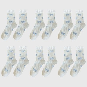 Indulge in cozy charm with our Women's 6-Pair Bow Pattern Crew Socks, designed to bring a touch of sweetness and comfort to your everyday style. This set features four unique designs, each adorned with cute bows or hearts in soft pastel tones, paired with a fuzzy ruffled cuff that adds both style and a cozy feel. Crafted from ribbed fabric, these socks offer excellent stretch, durability, and all-day comfort, making them ideal for lounging at home, running errands, or pairing with your favorite boots and sneakers.