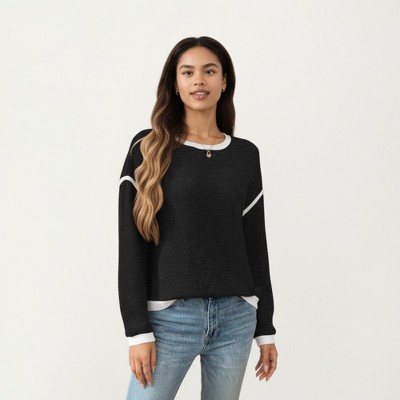 Product Name: Anna-Kaci Women's Crew Neck Long Sleeve Pullover Top with Colorblock Sleeve Detail - Black,Small