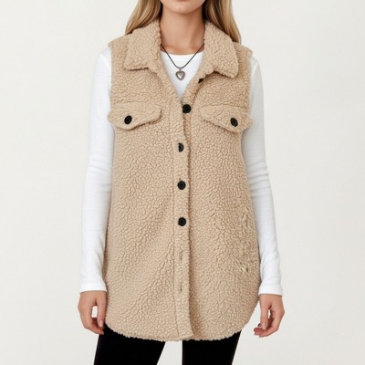 Anna-Kaci Women's Faux Shearling Button Front Vest with Collared Neckline, Chest Flap Pockets, and Longline Fit - 1 of 4