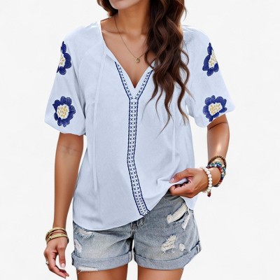The Anna-Kaci Women's Floral Embroidered Blouse brings a touch of elegance to your casual wardrobe. Featuring intricate floral embroidery along the sleeves and neckline, this blouse is designed with puffed short sleeves for a chic and modern silhouette. The lightweight fabric and V-neckline add a flattering, breezy feel perfect for warm days. Style it effortlessly with shorts or skirts for a polished and feminine look.