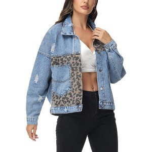 Anna-Kaci Women's Leopard Print Long Sleeve Crop Denim Jacket for Casual Looks - 1 of 4
