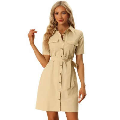 Product Name: Anna-Kaci Women’s Long Sleeve Button Front Dress with Soft Drape Tie Waist Detail and Smooth Structured Collarless Neckline Finish - Small, Khaki