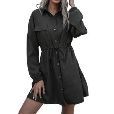 • Collarless Neckline: The simple neckline offers a modern, uncluttered finish that enhances the dress’s smooth, tailored appearance. Keywords: Anna-Kaci women’s dress, long sleeve tie waist dress, button front dress, smooth drape dress, structured neckline dress.