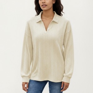 Anna-Kaci Women's Long Sleeve Collared Knit Top with Subtle Textured Pattern and Relaxed Fit - Beige,Medium