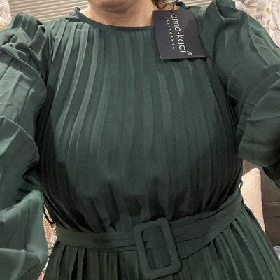 Product Name: Anna-Kaci Women's Long Sleeve Pleated Maxi Dress with Belted Waist and Round Neckline - Medium, Olive Green