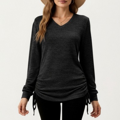 Everyday Versatile Style: Pairs easily with jeans, leggings, or skirts for a look that’s both casual and refined. Keywords: Anna-Kaci Women's Long Sleeve V-Neck Top, Side Ruched Drawstring Shirt, Soft Knit Casual Blouse, Adjustable Hem Pullover, Versatile Everyday Women's Top.