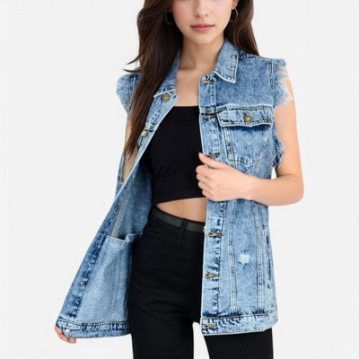 Distressed Details: Patches of distressing and ripped fringe on the raw hem armholes add a touch of edgy style to this classic denim vest, making it a standout piece in your wardrobe.