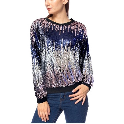 Elevate your party attire with our Anna-Kaci Women's Plus Size Sparkle Sequin Sweatshirt for glamorous festive seasonal event looks. Featuring a sparkly sequin design with long balloon sleeves and a mock neckline, this sweatshirt offers a relaxed fit and is suitable for various occasions from parties to dance shows, concerts, and holiday celebrations.