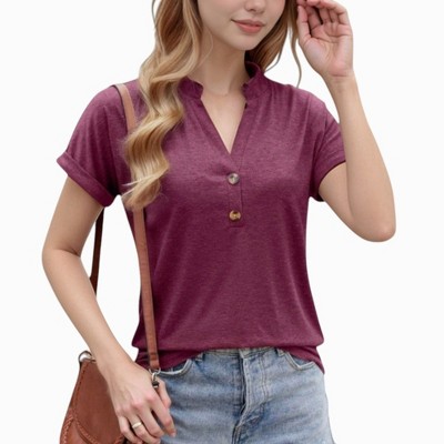 The Anna-Kaci Women's Short Sleeve V-Neck Blouse offers effortless style with a modern twist. This casual top features a notched neckline with two decorative buttons for added interest and rolled sleeves for a laid-back feel. Made from soft, breathable fabric, the blouse provides a relaxed fit that drapes comfortably on the body. Easy to pair with jeans or skirts, it's a versatile essential for any everyday wardrobe.