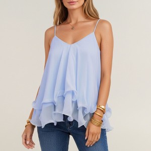The Anna-Kaci Women's V Neck Chiffon Cami Top features a soft, flowing silhouette with delicate layered ruffle detailing that creates elegant movement. Designed with slender adjustable shoulder straps and a flattering V neckline, this top offers a lightweight, airy feel with a refined drape. The layered hem adds dimension and a gently cascading finish, enhancing its relaxed yet polished appearance. Crafted from smooth chiffon fabric, it delivers a breezy, feminine look with graceful fluidity.
