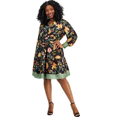 Anne Klein Womens Jenna Border-Hem Elastic-Waist Floral Midi Dress, black, 3X