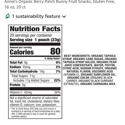 - CONTAINS: One 15.4 oz Value Pack of Annie's Organic Berry Patch Bunny Fruit Flavored Snacks; 22 pouches