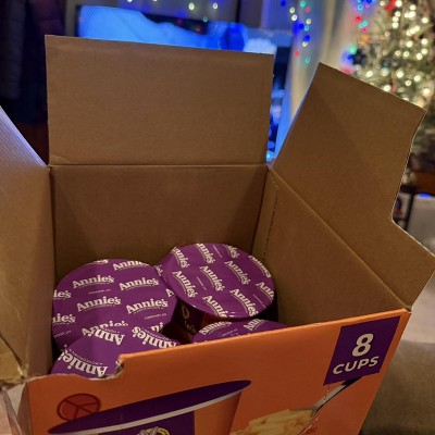 - Four pack of 2.01 oz cups of Annie's Real Aged Cheddar Microwave Mac and Cheese with Organic Pasta