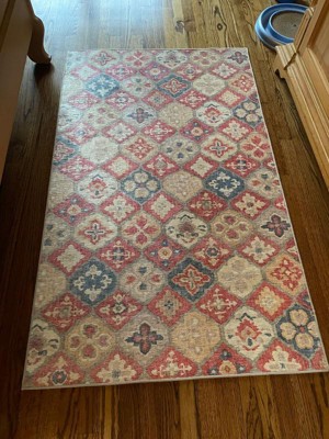 [This review was collected as part of a promotion.] This rug is beautiful, lays nice and flat. Colors are accurate to what you see online. Edges are a teeny bit frayed but I don’t care - a couple of quick reinforcements with needle and thread will fix it. It also cleans up with a quick shake - all the bits and dust fly right off.