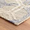 A: The rug features stylized motifs of interlocking honeycombs in blue and natural hues.