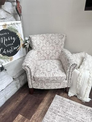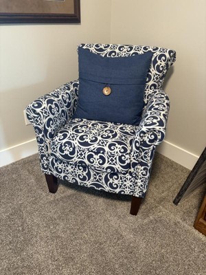 A: Hi Snip, thank you for your inquiry regarding the Madison Park Annie Tight Back Club Chair. The chair has the following measurements: 29.25 inches in width, 31 inches in depth, and 34.75 inches in height. For more detailed measurements of the chair, please refer to the Specification Section on the product page. There, you will find comprehensive and accurate information about the chair, including any additional measurements or specifications that may be relevant. In terms of fabric composition, the upholstery of the chair is made from a blend of 56% Rayon and 44% Polyester. This combination of materials is chosen to provide both comfort and durability, allowing for a stunning transitional look with the all-over fretwork pattern. If you have any further questions or require additional information, please feel free to reach out. We are here to assist you and ensure that you have all the details you need.