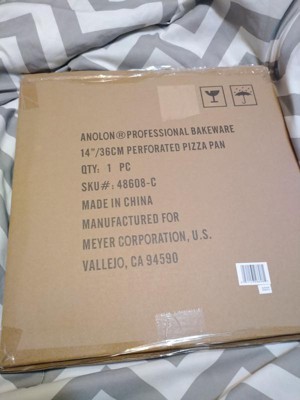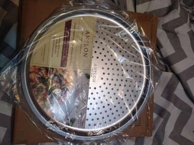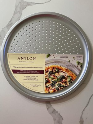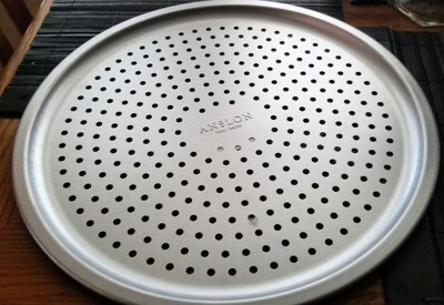 [This review was collected as part of a promotion.] Great Anolon 14-inch aluminized steel perforated pizza pan. Nonstick, nice pan, pizza gets done quickly from the bottom to the top. Perfect - aluminized pan for any Large pizza. Nice pan, totally recommend it!