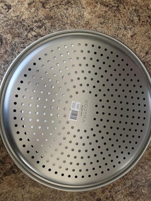 [This review was collected as part of a promotion.] I truly am impressed with the overall quality, quality, and durability of this 14 inch aluminized steel perforated pizza pan. The perforated pan allows for air to circulate around the food which creates even baking and allows exceptional crisping of the pizza edges. The rim of the pan is rolled which helps to prevent warping of the pan. This pan is made with excellent quality and its heavy duty. Clean up is easy. This pan is hand wash only. My pizza comes out cooked perfectly every time. I highly recommend this product as it will not disappoint.