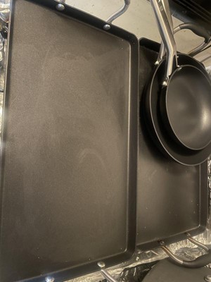 [This review was collected as part of a promotion.] Okay, my husband and used this thing almost every night since getting it! The hard anonized non stick double burner griddle is so amazing! The first night I put sausages on the Top of the rack and filled the pan underneath with peppers and onions. The next morning we did breakfast! Love it! Easy to wash and convenient handles make it even better!