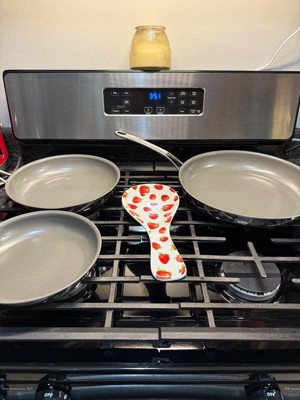 [This review was collected as part of a promotion.] This 3 pack of pans is the best thing I’ve come across in a long time! I’ve put these pans through their paces and nothing, and I mean nothing sticks to the ceramic coating. The rivets inside the pan are flush which makes them even more easy to clean, food doesn’t get stuck around them like all my other pans. I didn’t even know that was a feature in a pan that I needed! The handle is thick and solid, I can grab right onto it without a hot pad because it does not get hot with use. Everything I’ve cooked in these has been heated evenly. And they are oven safe which is perfect for some of the meals I make. I most definitely will be buying other sizes and replacing my old pans. I can’t wait to have a full set!