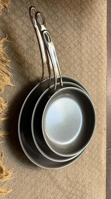 [This review was collected as part of a promotion.] This is a great nonstick set of pans. I love the versatility of having different sizes. They are super easy to clean and the design of the handle seems sturdy and hefty!