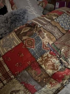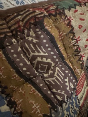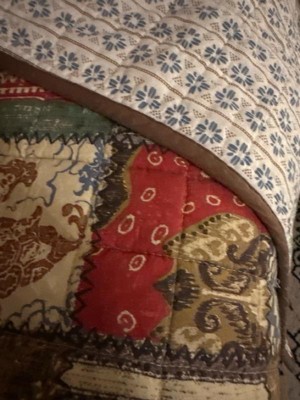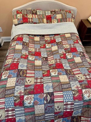 The Ansara Reversible Quilt Set by Levtex Home is inspired by an antique patchwork quilting design. Offered in red, grey, taupe, green, blue and brown, this design will immediately transform your bedroom. This reversible quilt features a beautiful collection of various colorful patterns on the front, reversing to a rows of mini icons in blue and taupe on a cream ground on the back. The Quilt and Shams have a cotton front and back, filled with a cotton-rich filler and are machine washable. Enjoy this for years to come!