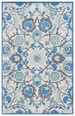 The rug's sumptuous wool construction promises both comfort and longevity, while its lush blue and ivory hues play host to a classic pattern that captivates the eye. The intricate design exhibits a harmonious balance of floral and geometric motifs, encased in a contrasting border that anchors the rug with sophistication.