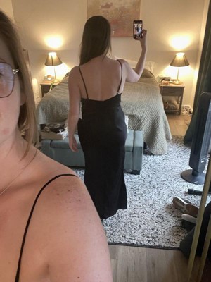 • A: The dress features a slip style that enhances its modern sophistication.