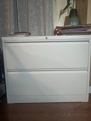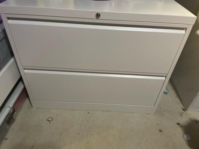 This 2 drawer filing cabinet features an adjustable hanging bar in each drawer to conveniently organize files and other important documents. Both drawers lock shut in a single turn to keep the contents secure. With a durable steel design, this black cabinet is a great storage option for garages, offices, or anywhere else you need secure storage in your home. This cabinet features an interlocking drawer system to keep the cabinet from tipping over when the drawers are open. With 2 locking keys included, you can still conveniently open the cabinet if 1 key is lost. This storage cabinet measures 35.43 inches long, 18.11 inches wide, and 28.34 inches tall to keep things safe in your home or office space.