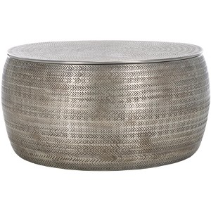 Lend an elevated and polished touch to any room with our Apoline coffee table with storage. With a gleaming finish, rich artistry, and added storage, our coffee table brings convenience and charm to any room. Its round drum shape is made from aluminum with a stunning antique brass finish. With an intricate chevron pattern engraved onto its surface, our coffee table serves as a glamorous and charming centerpiece for any room. Its top can easily be removed to reveal roomy storage inside for keeping your lounge or bedroom tidy at all times.