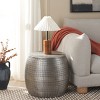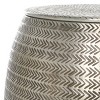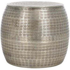 Glam up your space with our sleek and beautifully detailed Apoline side table with storage. With a gleaming finish, rich artistry, and added storage, our side table brings charm and convenience to any room. Its round drum shape silhouette is crafted from aluminum with a stunning antique brass finish. With an intricate chevron pattern engraved onto its surface, our side table serves as a glamorous and charming companion to your bed, sofa, or armchair. Its top can easily be removed to reveal roomy storage inside for keeping your lounge or bedroom tidy at all times.