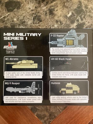 If you have a passion for military aircrafts and innovative warcraft equipment, the Apostrophe Games miniature army building block sets are the perfect building experience. This 5 pack of Military blocks includes an F-22 Raptor, M1 Abrams Tank, Black Hawk Helicopter, Reaper UAV and Humvee military truck scale models. The Mini Military Building Block Set encourages creativity, problem-solving, and imaginative play.
