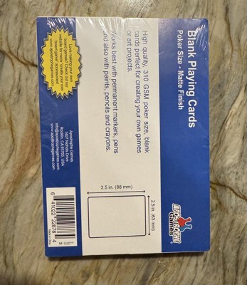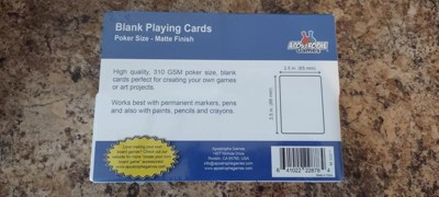 Whether you're an avid gamer looking to invent your own card game, a student in need of personalized flashcards for studying, or an artist seeking creative solutions, Apostrophe Games Blank Playing Cards offer endless possibilities. Standard-sized playing cards. Each pack contains high-quality blank cards, without any pre-printed designs, numbers, or symbols, allowing you complete freedom to customize. Dimensions as regular poker cards, measuring 2.5 inches by 3.5 inches (63 mm × 88 mm).