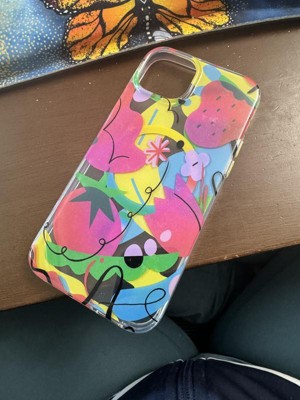 A: The case features quirky, colorful patterns on a transparent background for added style.