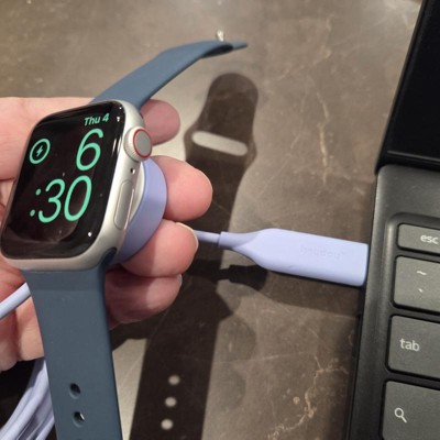This heyday Apple Watch charger has a 6 foot cord and a USB-C connection. Just place your Apple Watch on the charger, and the magnets will snap it into position. It works just as well as my Apple charger, and the periwinkle blue is a nice change from the standard white.