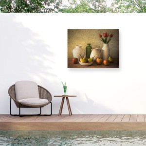 This ready to hang, gallery-wrapped art piece features a ceramic table setting in a grainy photograph.1x is not your average photo site. All photos on 1x are selected by a team of professional gallery curators, just like in a real photo gallery. Our curators have experience from well known institutions such as Sotheby's and Tate Modern Art. We believe that everyone has an inner photographer, just waiting to be discovered. Getting published on 1x is a great achievement; many photographers whose works now hang in art galleries were once discovered on 1x. It's no coincidence that art directors, book editors, and magazines all over the world use photos from 1x photographers.The Outdoor Canvas Art by Trademark Fine Art is a great way to add a pop of color to your poolside, balcony, backyard, garden, or porch. This all-weather outdoor decor is printed with UV gel inks to prevent fading for years to come. These colorful outdoor pictures for the patio have been digitally reproduced, printed on all-weather artist canvas, stretched, and gallery wrapped on all-season stretcher bars for a clean finish.