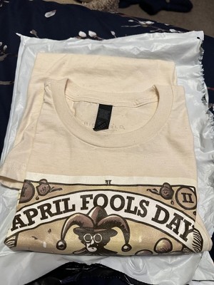 - Custom Design: Displays a sepia card of a court jester and dog with banners reading "April Fools Day, Let's Get Silly," adding a fun, playful touch to your wardrobe