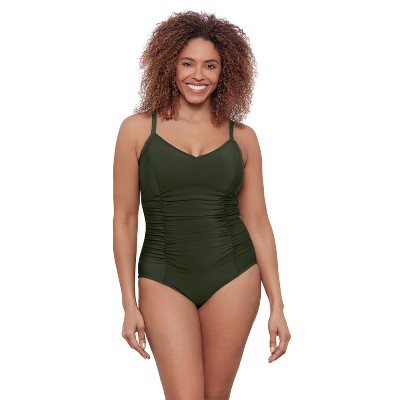Aqua Green is a solution-oriented swimwear collection of classic silhouettes focused on comfort, coverage, and versatility. This collection is designed to support and flatter all women. Flaunt your figure and showcase your shape in the Ryan Cinched One Piece Swimsuit. The flattering v-neckline features an adjustable cinched tie at the front for a customized fit, while the shirred sides create a slimming effect. Sewn in cups provide shape, support, and all day comfort.
