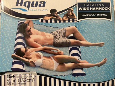 [This review was collected as part of a promotion.] I received a few weeks back a 2 person Catalina wide hammock drifter. The weight capacity is up to 450 lbs. The inflated width is 52 in (132 cm). Making it perfect for two people to drift along on their stomachs enjoying the head rest or using as a hammock relaxing in style. Either way you to choose to enjoy your Catalina your gonna love it as much as I do.
