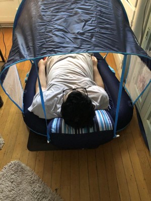[This review was collected as part of a promotion.] Bout this to relax in the pool with a little shade when I don’t want the sun in my face. Was easy to inflate, holds my weight really good and has not lost any air. Blocks the sun really well and is really comfy. Great float to kick back and relax in