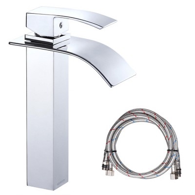 This Aquaterior Waterfall Spout Single-Handle Faucet comes with a thin arched spout perched on a solid square base in a simple yet stylist design, acting as a decorative yet functional piece and enhancing the aesthetic appeal of your bathroomDesigned to be compatible with most countertop sinks, it features an unique square nut for easy tool-free installation within minutes, ideal for DIY installationConstructed of a sturdy brass body with polished chrome finish for great resistance against rust, corrosion, and scratches, along with an upgraded ceramic cartridge which supports 500,000 times of opening & closing, ideal for frequent and prolonged useComes with a single easily-operated lever handle for effortless adjustment of water flow up to 2.2 GPM at 60 PSI max flow rate, and precise temperature control for use in different weather and seasonsComes with CUPC and NSF certification for safety and quality assurance, along with 5 years warranty offering easy and fast replacements for any quality issue, ensuring your peace of mindSpecifications:Overall Dimension(WxDxH): 36 11/16" x 6 9/16" x 3 1/16" (93.2 x 16.7 x 7.8 cm)Faucet Dimension(above Deck)(WxDxH): 10 1/4" x 6 9/16" x 3 1/16" (26 x 16.7 x 7.8 cm)Spout Height: 6 7/8" (17.5 cm)Spout Reach: 3 15/16" (10 cm)Mounting Thread Size(Dia.xL): 1 1/4" x 2 7/16" (3.2 x 6.2 cm)Hose Fitting Inner Diameter: 1/2" (1.3 cm)Hose Dimension(Dia.xL): 3/8" x 24" (1 x 61 cm)Suitable Deck Thickness Range: 3/16" to 1 15/16" (5 mm to 50 mm)Required Pre-drilled Mounting Hole (Dia.): 1 1/4" to 1 1/2" (31 to 38 mm)Suitable Water Temperature: 41 to 159.8 degrees Fahrenheit (5 to 71 degrees Celsius)Max Flow Rate: 2.2 GPMSuitable Water Pressure: 60 PSIPackage Contents:1x Faucet2x Hot and Cold Water Hoses1x ManualNotice:If you want to install this faucet on a 3-hole sink, a deck plate is needed (not include in the package), please purchase by yourself.