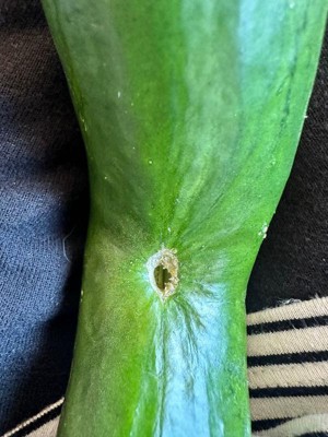 I was so angry to find that I was a victim to the dreaded squash vine borer in my cucumbers! Again, instead of starting with a preventative treatment from the beginning, I waited until it was too late. I only noticed in one cucumber but when there's one there's more! I started the same day using the bio insecticide and that was the first and last that I had.