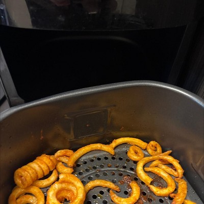 A: Hi PMK, sorry for the delayed response! Here are the air fryer cooking instructions: Place the frozen curly fries in the air fryer basket and spread out evenly. No oil spray is needed. Air Fry at 400°F/205°C for 10 minutes. Shake and gently stir about halfway through cooking. If needed, air fry at 400°F/205°C for an additional 1-4 minutes or until crisped to your liking. For Food Safety and Quality, KEEP FROZEN; do not thaw. Appliances vary. Adjust cooking times as needed. PRODUCT MUST BE COOKED THOROUGHLY. Internal temperature needs to reach 165*F as measured by a food thermometer in several spots. Read and follow these cooking directions.